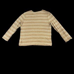 This vintage Lauren Ralph Lauren long sleeve top features a timeless striped pattern in neutral browns, offering versatile styling options. Crafted from a lightweight, stretchy fabric, it ensures comfortable wear throughout the day. The three delicate buttons on the left shoulder add a subtle, refined detail that enhances its classic appeal. Ideal for layering or wearing alone, this piece combines elegance with everyday practicality.
