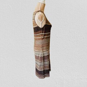 Linen, Cotton & Viscose Striped Southwestern Style A-Line Sweater Dress. Sleeveless, bateau neckline, black, brown and tan stripes, textured knit. Has various types of stitching including seed and has a bit of a crochet look, is slightly sheer. Tagged Petite Medium check measurements. Shown on a 34-26-36 form.