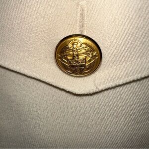 Signature Ralph Lauren gold tone buttons along front, pockets and cuffs, feature an eagle crest with a shield below banners, inscribed "Libertad Y Orden" (Freedom & Order)