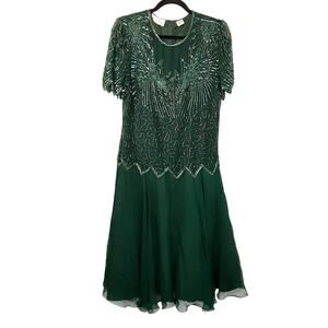 Vintage Laurence Kazar NY Beaded Gown 100% Silk Dress Drop Waist Green M 1920s