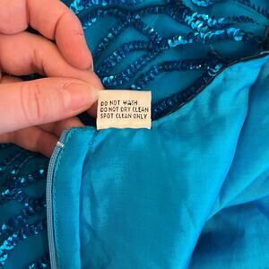 Very good pre-owned condition. There are only a few small spots on the dress where the sequins are missing- at left shoulder, midway down back zipper, at very top of zip closure, a loose thread at center of bottom hem, and a few loose threads at top of back slit. Brand tag is detached on one side.