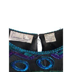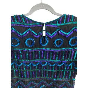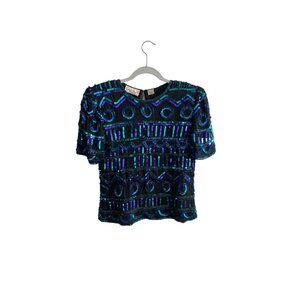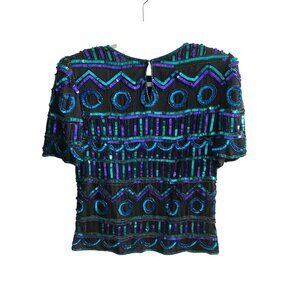 Vintage Laurence Kazar Sequined Silk Top Black Blue Green Short Sleeve Petite Me