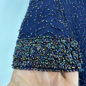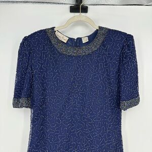 Vintage Laurence Kazar Silk All Over Beaded Mini Dress Size L Navy Cocktail