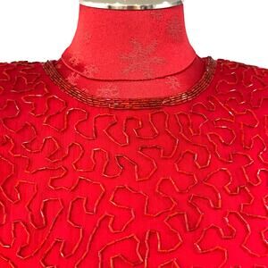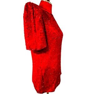 Vintage Laurence Kazar red silk top with beaded design Size S short sleeves