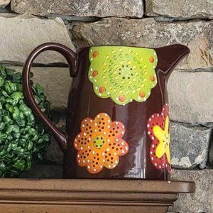 Vintage Laurie Gates Ceramic Chocolate Brown Pitcher With Flowers