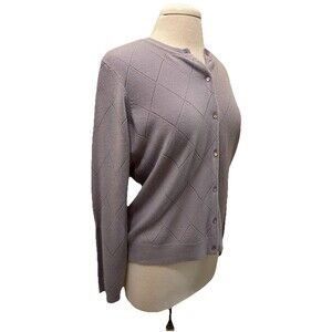 This Vintage Lavender Casual Corner Long Sleeve Diamond Cutout Cardigan Sweater in size L is a stylish and comfortable addition to any woman's wardrobe. Made from acrylic material in a tight-knit fabric, this cardigan features a classic round neck, raglan sleeves, and button accents. The vintage style with a purple color and 90s retro theme makes it perfect for casual occasions in the fall, winter, or spring seasons. Its lightweight design adds a cozy touch to any outfit, making it a versatile piece for everyday wear.