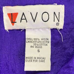 Step back in time with this vintage Lavon windbreaker jacket from the 1980s. This purple and blue jacket is made of high-quality nylon material, ensuring durability and comfort. The zip-up with button style and jacket design make it perfect for any occasion, and the size small fits true to size.