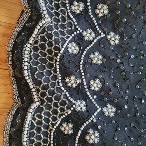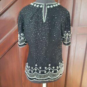 This vintage blouse showcases intricate beadwork and sequins on a black fabric, highlighted by elegant silver embellishments. Ideal for formal or evening wear.