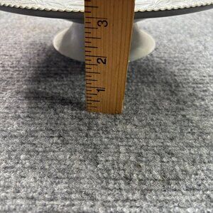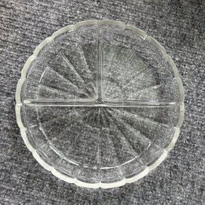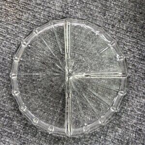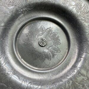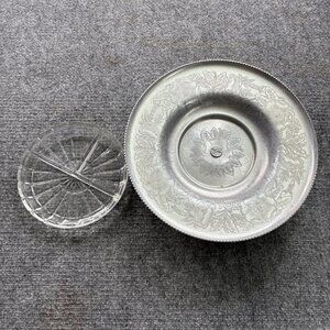 This vintage serving tray features an elegant floral pattern on a silver lazy Susan base, complemented by a removable glass insert. The glass insert is divided into 3 sections. Ideal for serving appetizers or snacks, it combines style with practicality. The intricate design adds a touch of sophistication to gatherings, making it a timeless piece for entertaining.