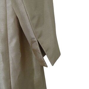 A structured gold dress with a lightweight polyester trench coat in a neutral gold tone, featuring a classic open front design with lapels, long sleeves, and side slits for added movement and style.