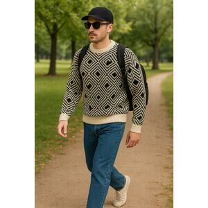 Vintage LeRoy Knit men’s sweater with bold black-and-white geometric illusion pattern. Size Medium. Made in Taiwan, this 1980s–90s piece features a soft blend of 70% acrylic and 30% cotton. Drop-shoulder silhouette and ribbed collar/cuffs/hem. Slightly oversized vintage fit. PTP 22", length 28". Perfect for retro fashion lovers, vintage collectors, or bold streetwear styling. Easy to layer in cooler months or wear as a statement piece.