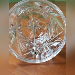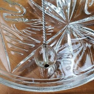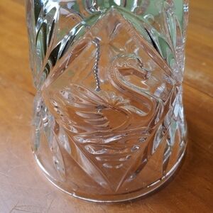 Vintage lead glass bell with glass ball on delicate metal chain on the interior. Pattern on the bell includes two cut swans and two starburst patterns on each side. There is some slight discoloration from the adhesive holding the chain on the interior - see pictures.
