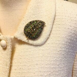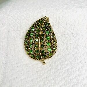 Vintage Leaf Brooch Green Emerald Glass Rhinestone Leaves Pin Goldtone Filigree
