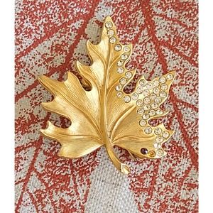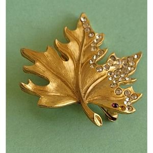 Vintage Leaf Brooch with Rhinestones - Stamped by Manufacturer