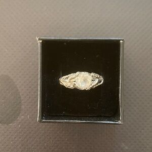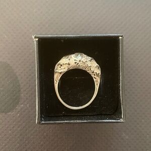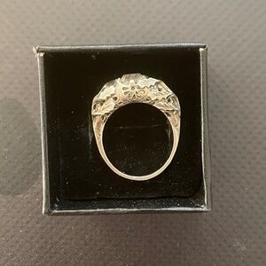 Stunning vintage crystal ring! Sterling silver (stamped "sterling"), beautiful and ornate leaf patterning coming from the sides and spreading out along the top, large faceted crystal in the center, and half flower design on top and bottom of ring. Approximately a size 8. This a super unique piece! The crystal is slightly loose in the setting. One of a kind!