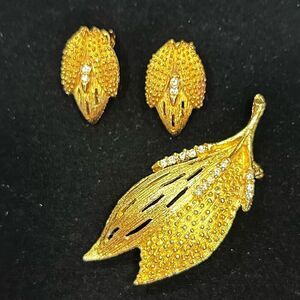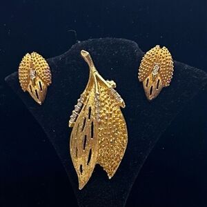 Vintage Leaf brooch & Matching Clip-on Earring Set Women's Gold-tone Textured