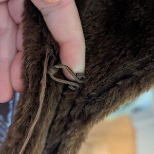 Hidden inside hooks to button up the coat, hidden inside pockets, suede exterior, faux shearling/fur interior.