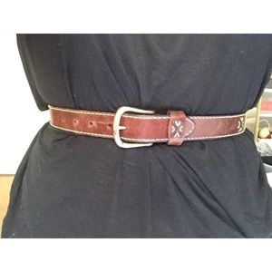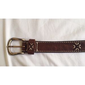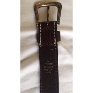 Italian leather belt in a size large in dark brown with light burnished edges. Belt has contrast white waxy cord pick stitching and leather laced design. Buckle is oxidized brass. 36 1/2" Long x 1 1/4" wide. Never used.