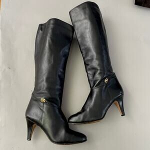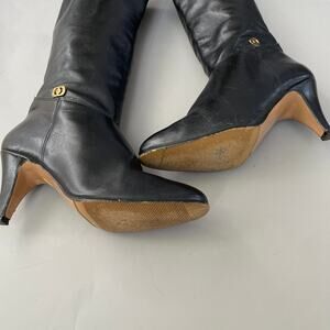 70s Side zip cone heel boot with gold detail . Marked made in Italy . Size 7.5 .n leather worth fabric lining . Fair condition with some signs of age , dry rubber sole. Has a few wears a but could be re-soled