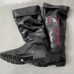 80s/ 90s lug sole flat soft scrunch boot. Faux fur lined . Fold over top . Made in Italy . Size 7 . Red snake appliqué detail . Good wearable condition with minor signs of age , a few scuffs