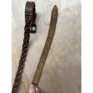 This vintage braided belt is a must-have for any fashion-savvy woman. Made from high-quality leather, it features metal details that add a touch of edginess to the design. The belt is sized M 32 and is perfect for any occasion, whether you're dressing up or down.