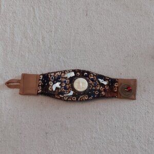 Vintage Leather, Cloth & Beaded bracelet with Chinese Coin clasp. Handmade. Measures 7 1/2" long x 2 1/8" wide. Mother of pearl, bone and glass beads.