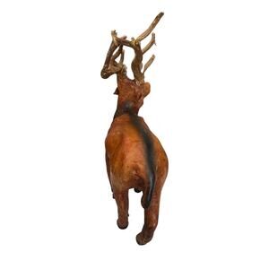 Vintage handmade leather wrapped deer figurine is a buck with 12 point rack antlers. Glass eyes and painted on nose and mouth and hooves. Little leather ears. Appropriate time worn appearance. This buck will look great in a library, on a desk, or anywhere in your home for a more rustic decor. Measurements are approximate and as close as possible. 8 inches wide from nose to tail, 9 1/4 inches tall from foot to end of antler, body is approximately 2 3/4 inches thick., Legs are approximately 3 inches long.