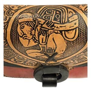 This highly structured purse was crafted with high-quality red, black and beige leather and features an intricate hand-tooled design of a figure carrying a sack and other carved details. The clever design incorporates a round wooden loop and leather closure. It has black leather stitching, metal studs attaching the strap on either side, and the phrase "Hecho in Mexico" ("Made in Mexico") on the side.