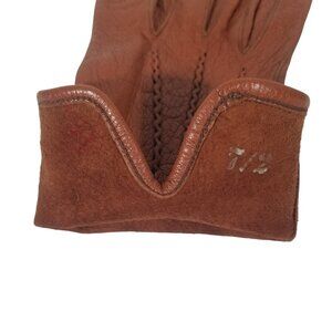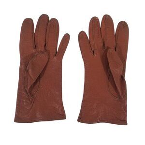 Vintage butter-soft kid leather gloves in the most gorgeous dark amber color, likely from the 40s or 50s. Short wrist length, with a vent and nice detail stitching. Only lightly if ever worn, with just two tiny areas of slightly darker coloration (top of the left hand at base of index finger and just below ring finger).
