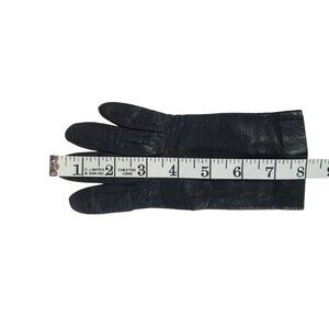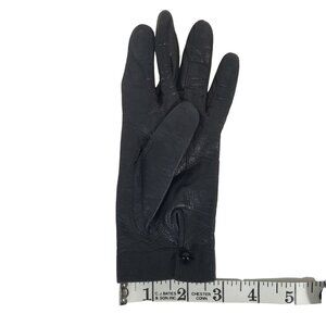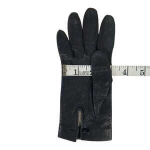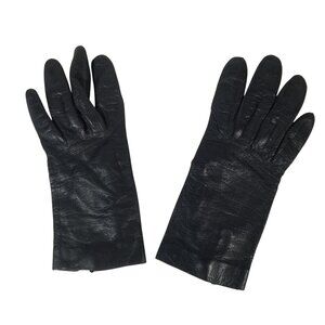 Historic Fownes Brothers, silk-lined, super soft, black leather gloves made in Italy, probably from the 50s. Wrist length, with button closure, in lightly used but otherwise great condition (that twisted finger is just from storage and will straighten right out with use). Just a slight bit of yellowing near the top of the gray 100% silk lining. Not sure what the superscript 2 means, so selling as a size 6. For a woman with small hands, and great for a teenage girl, especially one into wearing black.