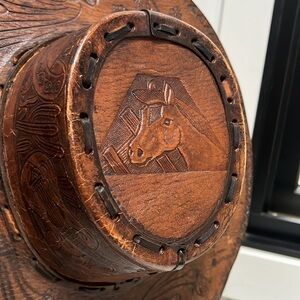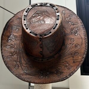 This is a great Vintage Leather Hand Tooled Hand Made Leather Western Gaucho Hat. The size is approximately 7 1/2 , as 23.5” equals to in hat size. Some spotting. Some of the interior whipstitching has broken, but the hat wears perfectly. Motif is a Beautiful guitar, sombrero, desert and Mexico art hand tooled with flowers. No odors