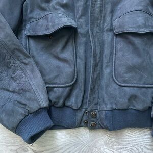 royal blue, padded shoulders, thermal insulation, front pockets, adventure style, rugged leather, oversized fit, vintage outerwear, bold color, functional design