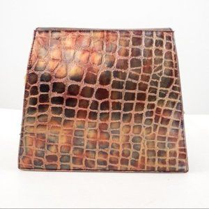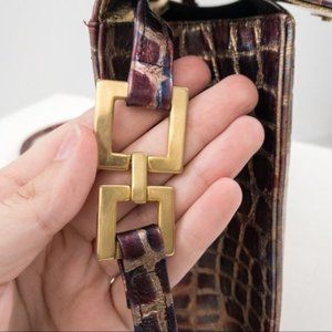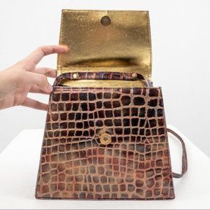 Dope vintage 80s metallic leather crossbody purse embossed w crocodile skin print. Real leather made to look like crocodile / alligator. Chameleon opalescent shine bronze shoulder bag. Unique vtg, w trendy modern square shape. Magnetic snap closure on flap. Zipper pocket inside. Faint back scratch p9. GUC. Fab holiday gift!