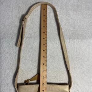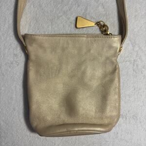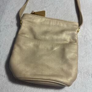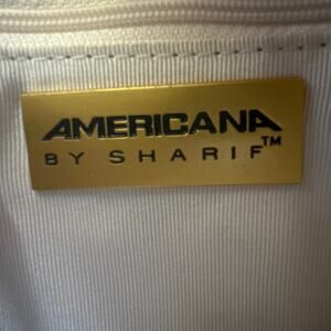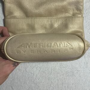 Gorgeous Vintage SHARIF Cream Colored Genuine Leather Mini Barrel Shoulder Bag. Color has a metallic satin finish too it. Smoothed gold tone chunky hardware - very 80s/90s. “AMERICANA BY SHARIF” is tooled into the bottom of the bag for a cute design touch. Bag is in great condition. Interior has a zippered pocket and there is an exterior side pocket as well. Strap is adjustable.