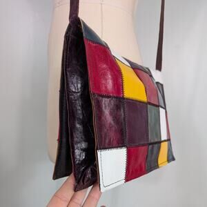 Vintage Leather Patchwork Shoulder Bag Clutch Flap Brown Red Yellow Artsy Funky