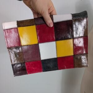 Vintage 90s Leather Patchwork Shoulder Bag / Clutch Purse Handbag by Valerie - Size 11.5" x 8" - Brown, White, Red, Yellow & Green