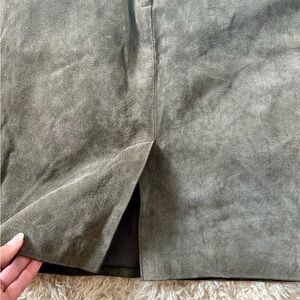 Elevate your style with this chic olive green leather skirt. Its sleek design offers a sophisticated look, perfect for any occasion.
