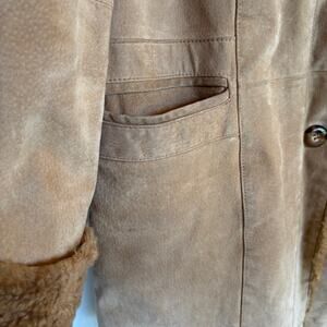 Luxurious light golden tan brown leather with teddy bear faux fur at sleeve cuffs and lining the coat