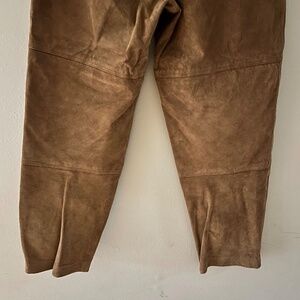 these pants are incredible! Lined soft, sueded leather with front pleats and barrel detailing. Size vintage 10 with approximate measurements laying flat of 14.5" waist, 12.5" rise, and 28" inseam. In excellent vintage detail-- minor signs of storage/wear (all in photos) . From a smoke-free, dog friendly home.