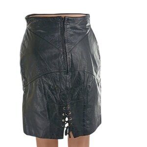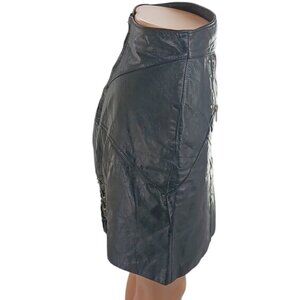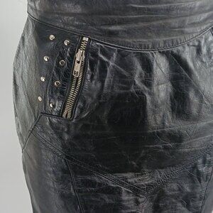 Vintage Leather Skirt Black Straight 80s Studded Zipper Pockets Retro Size 8