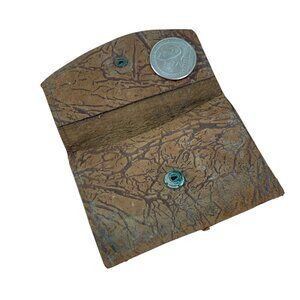 Visible signs of wear and aging on the leather exterior. Coin for scale comparison. Closed size: approx. 3 x 4 inches.