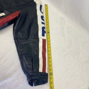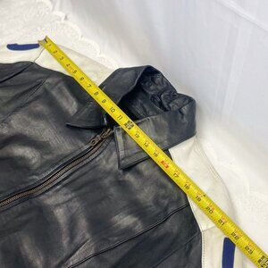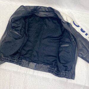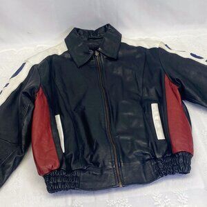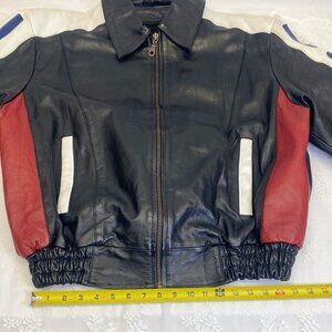 Type: Black Leather bomber jacket with USA down both arms and American flag on the back.