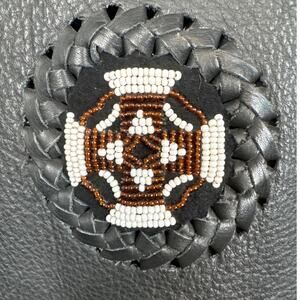 This native american leather vest in Size 44 features intricate beading and snap closures. Black with brown, white and black beading.