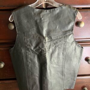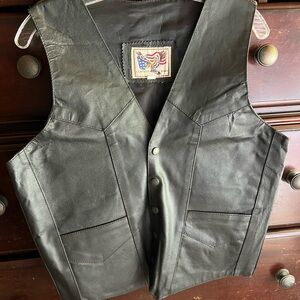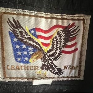 Channel rugged Americana with this Leather Wear black leather vest in size Large. Crafted from genuine leather (unmarked but appears authentic), this vest features a bold embroidered eagle and American flag patch on the inside label, classic western-inspired paneling, and snap button closures. A timeless piece for bikers, collectors, or anyone adding edge to their outfit.