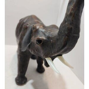 This vintage leather wrapped brown elephant figurine is a realistic and unique collectible piece. Measuring 13" long and 10.5" wide, it features intricate details and craftsmanship. The elephant figurine is made with leather wrapping, adding a touch of texture and authenticity to its design. Perfect for animal lovers and collectors alike, this piece captures the majesty and beauty of one of the world's most beloved creatures. Pre-owned by collector. In good condition. Please see pictures for details.