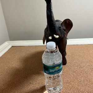 This elephant has glass eyes and plastic tusks. The leather has some scrapes otherwise in good condition. I believe he/she is from the 1980s.