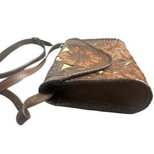 Vintage Leather small crossbody tooled hand bag brown/tan embossed