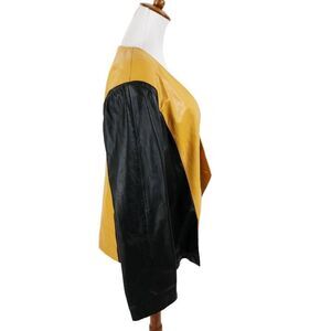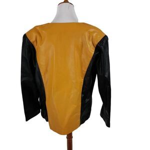 This stunning vintage leather jacket combines bold design with timeless sophistication. Featuring a striking two-tone mustard yellow and black leather design, the jacket boasts mustard yellow front panels and contrasting black leather sleeves and back. The overlapping double-breasted closure is secured with two matching mustard buttons, while the deep V-neckline and structured silhouette add a bold, modern edge. A unique and versatile piece, perfect for elevating your wardrobe.
