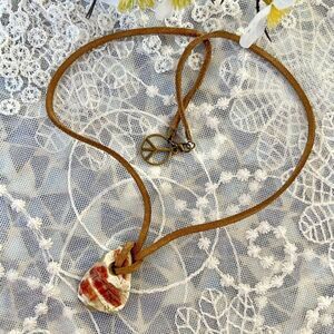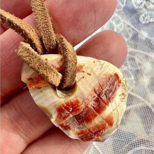 Thick genuine leather cord with a thick piece of scavenged shell as a pendant focal point. The shell looks good either side forward, with abalone colors on one side and rough orange/mother of pearl on the other side. A thick piece of Abalone shell I believe.