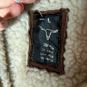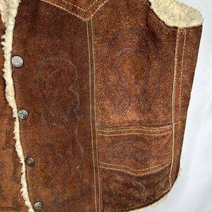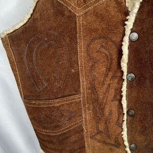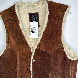 Vintage Leather/Suede Horse Printed Sherpa Lined Western Vest. Size Large. Horseshoe print on front and horse print on back. Snap button closure. New with tag (Dead stock).